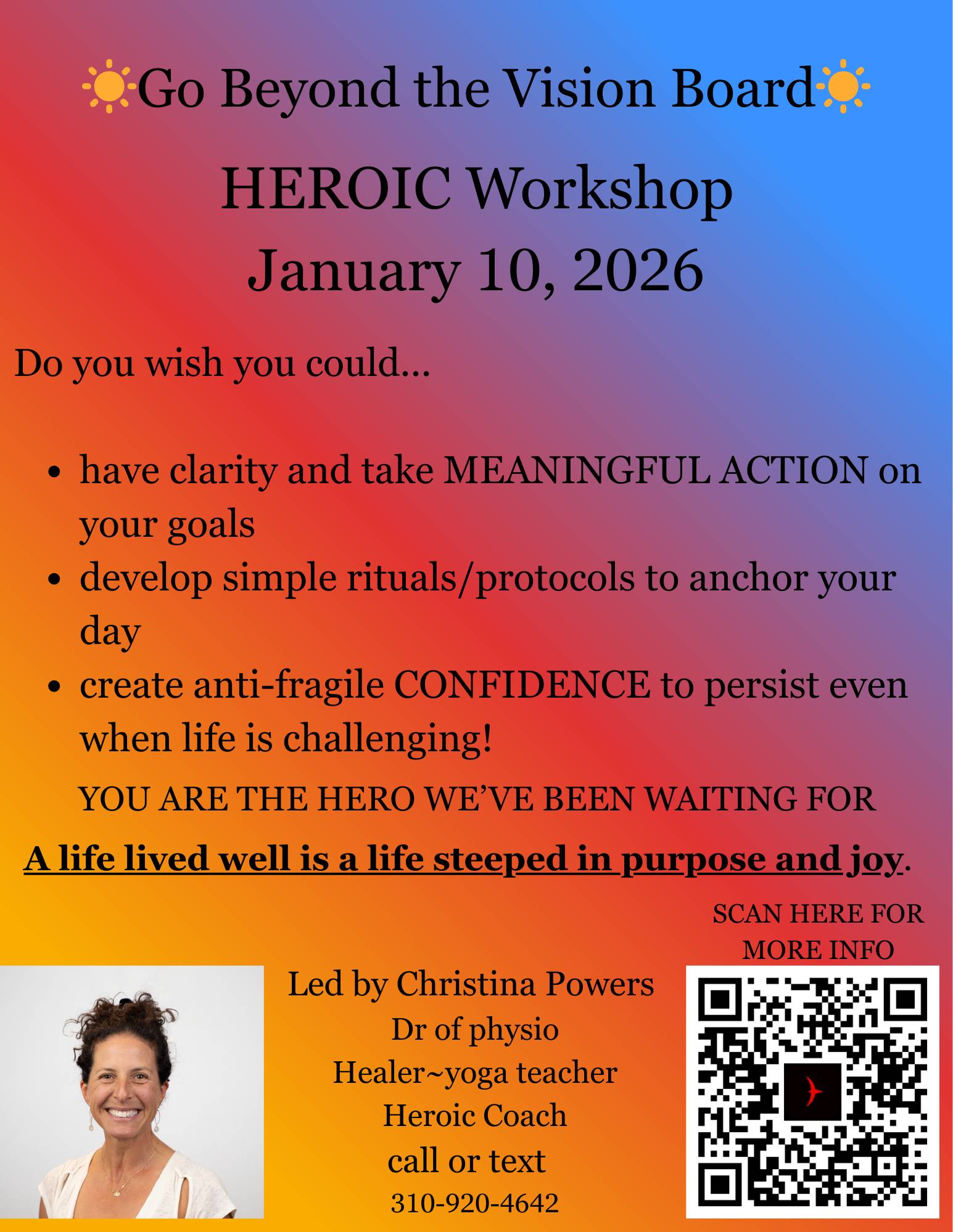 I’m going to tell ya, Reader, though I don’t ”need” my phone - it was sure nice on vacation for my phone to accidentally take a snorkel! I GOT to miss calls between 29 December and 3 January. What that let me do was - check in on my inner call system. What have I learned this past year? What am I composting for behaviors / mindsets? (mine: up late reading, rushing around, negative thoughts, not listening well, reacting > creating) One of my favorite tools for checking in with my learnings and applying it forward is taking a perspective shift. I have to —> I choose to Lack —> abundance Need or want? Talking over —> listening in Also, I love journaling my 5 things / day I am grateful for. What are your perspective shifts? In your own words? Can you embody the strong, radiantly alive version of yourself - IN ORDER TO STEP INTO YOUR TRUE POTENTIAL? Take the time now - yes now 😆 - to ask yourself what small shifts need to happen AND what’s the micro / small action to take to move you towards that. +1+1+1+1…infinity I know you got this!!! Be Well Xo cp ❤️ PS. HIT REPLY and tell me your shifts and how you plan to move beyond just words and take action this year! PPS. If you are in So Cal this weekend, come join our Heroic Global Activation Day! Click here and use the code ACTIVATE50 for a special subscriber 50% off!!! all the love ❤️cp xo 💕Christina Doctor of Physical Therapy Heroic Performance Coach Yoga Teacher and Soul-full Wellness Movement Meditator YouTube channel: @Drchristina-powers |